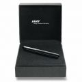 Psací nástroj, který je zosobněním všeho, co je tak typické pro značku Lamy - neotřelý, někdy až avantgardní design jdoucí ruku v ruce s unikátním technickým řešením. Rafinované technické zpracovaní otočného mechanismu pera, které brání potřísnění obleku inkoustem. Otočením dojde k vysunutí zlatého hrotu a zasunutí klipu do těla a naopak. Tělo lakované lesklým černým lakem, v kombinaci s doplňky pokovenými platinou. Plnicí pero: otočný mechanismus vysunovací zasunovací klip bez víčka dvoubarevný hrot z 14karátového zlata (ryzost Au 585/1000) zdobený platinou Dodáváno modrou bombičkou a standardním konvertorem s pístem pro plnění pera inkoustem z lahvičky, v dárkové kazetě.