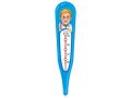 Teploměr s českým hlasem. Světlo na teploměru ukáže naměřenou teplotu a hlas doktora pacientovi poradí. Stiskem hrotu teploměr řekne jednu z osmi českých vět. Napájení 3 x 1,5V AG 13 baterie. Česká karta. Výška teploměru 16 cm. Rozměry karty 22 x 10 cm.