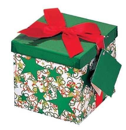 Dárková krabička skládací s mašlí vánoční M+ 17x17x17 cm - 1.ZELENÁ S ČERVENOU STUHOU