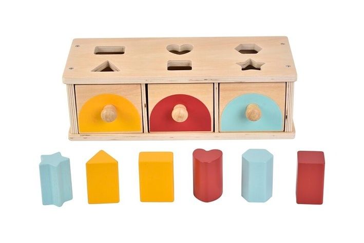 Chytrá dřevěná hračka, která spojuje zábavu s učením! Děti vhazují tvary do otvorů podle jejich barvy a tvaru. Každý ze tří šuplíků má nad sebou dva otvory a je zepředu barevně označen. Podaří-li se vhazovaný tvar správně roztřídit, sklouzne do odpovídajícího šuplíku. Dítě tak okamžitě vidí výsledek svého pokusu, což rozvíjí pochopení principu příčina–následek.Hračka podporuje logické myšlení, koordinaci ruka-oko a smyslové vnímání. Díky jednoduchému, ale promyšlenému designu se řadí mezi Montessori inspirované pomůcky. Děti se učí samostatně třídit, vnímat barvy, tvary i prostor.Kombinace přírodního dřeva s jasnými barvami spolu s jednoduchým a kvalitním provedením dělají z této hračky pěkný doplněk každého pokojíčku nebo herny.Hlavní vlastnosti:• 3 barevně odlišené šuplíky, 6 různých barevných tvarů• inspirováno Montessori• rozvíjí logické myšlení a jemnou motoriku• napomáhá k pochopení příčiny a následku• třídění podle barvy a tvaru• kvalitní dřevěné provedení• vhodné pro děti od 1 roku