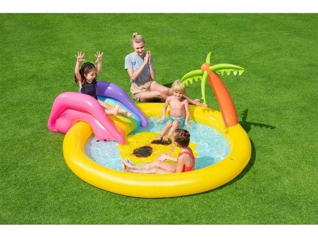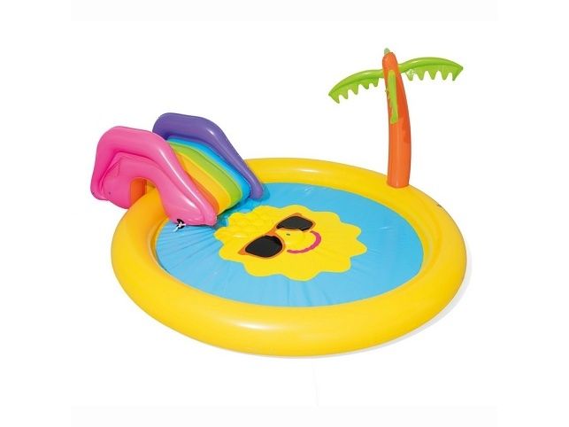 Krásné barevné nafukovací hrací centrum. Bazének se skluzavkou a rozstřikovačem bude ozdobou každé zahrady a nejmenší milovníci vodních radovánek budou nadšeni! Celý produkt je lehce připojitelný k zahradní hadici. Bazének nabízí odnímatelnou skluzavku a rozstřikovač vody pro osvěžení v horkých dnech. Po ukončení vodních radovánek snadno vypustíte vodu z bazénku pomocí vypouštěcího ventilu. Bazének má kapacitu 225 litrů. Balení obsahuje opravnou sadu. Hrací centrum o rozměrech 2,37 x 2,01 x 1,04 m. Hračka je určena pro děti 2+. Materiál hračky je odolný předem testovaný vinyl. Technická specifikace:Rozměr 2,37 x 2,01 x 1,04 mRozstřikovač uprostřed ochlazuje bazének, v němž je možné si hrát či posedětSnadno se připojuje k zahradní hadiciDemontovatelná skluzavka s uvazovacími lany a zabudovanými průchodkamiVoda se z bazénu vypouští snadno použitelným ventilemBezpečnostní ventilyOdolný předem testovaný vinylObjem vody: 225 l (59 gal. )Obsah balení: Jeden bazének, jedna skluzavka, záplata na opravu