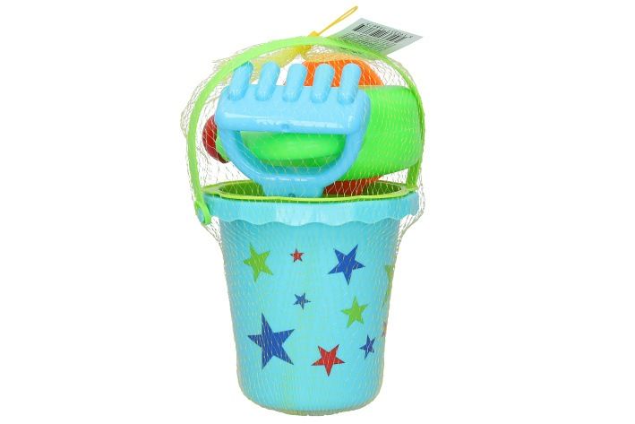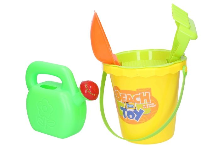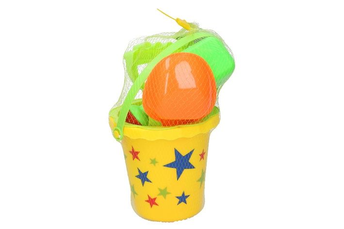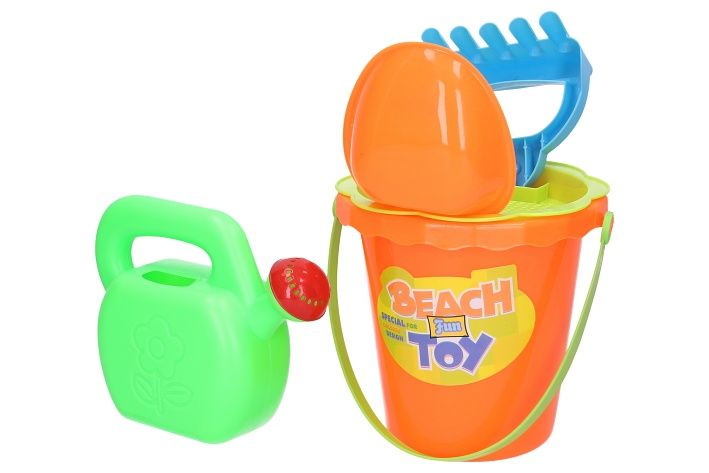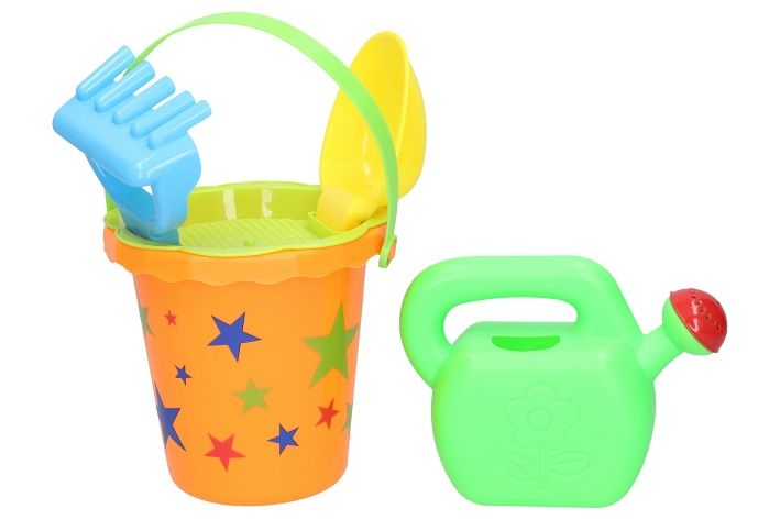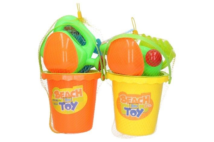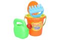 Sada na písek 15 cm 5 dílů. 2 varianty - žlutá, oranžová. Obsahuje kyblík, sítko, konvičku, hrábě a lopatku.