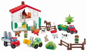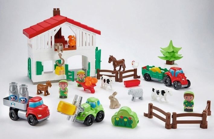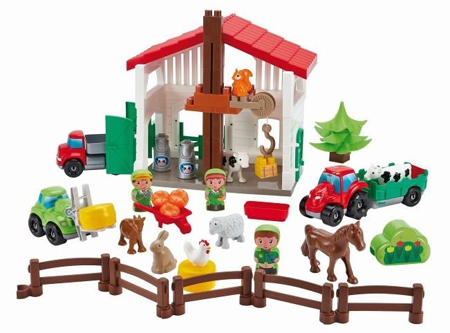 Ve dvoupodlažním statku Abrick žije spousta zvířat. Ve stodole žijí společně krávy, kozy, koně, ovce a kuřata. Během dne se mohou společně pást na pastvině, kterou lze oddělit ploty. Brány statku lze otevřít, aby vysokozdvižný vozík mohl vyložit balíky sena přímo do stáje. Traktory s přívěsy dělají na farmě všechnu důležitou práci. Vůz odváží mléko. Rozměry produktu (DxŠxV): 29,5 x 16,5 x 29,5 cm.