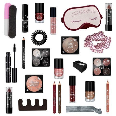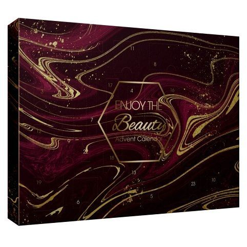 Adventní kalendář Enjoy The Beauty – kosmetický obsahuje – 1× tužku na obočí, 1× tužku na oči, 2× tužku na rty, 1 řasenku, 3× lak na nehty, 2× lesk na rty, 1× balzám na rty, 2× paletu očních stínů, 1× tvářenku, 1× zvýrazňovač, 1× separátor na nehty, 1× ořezávátko, 2× gumičku do vlasů nebo na ruku, spirálovou gumičku, 1× mašli do vlasů, 1× pilník na nehty a 1× masku na spaní.