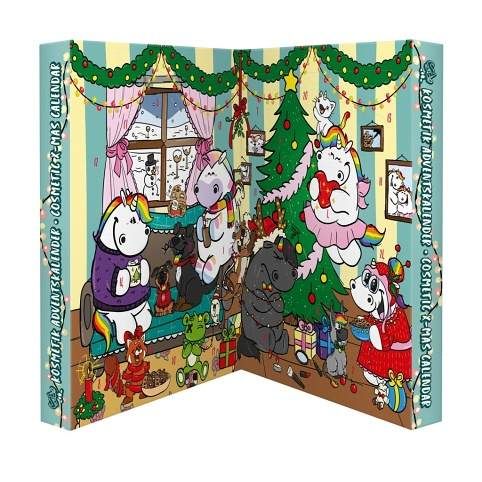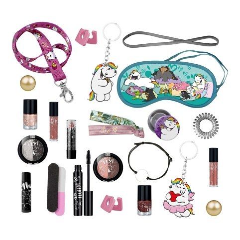 „Adventní kalendář Jednorožec a přátelé – adventní čas je pro Jednorožce a jeho přátele tím nejlepším časem, mohou otevírat dvířka každý den až do Vánoc a objevovat za nimi barevnou kosmetiku a doplňky. Obsahuje – 1×pilník na nehty, 2×lak na nehty, 2×2 separátor na nehty, 1× balzám na rty, 2× lesk na rty, 1× rtěku, 2× duo oční stíny, 2× mašli na ruku nebo do vlasů, 2× klíčenku, 2× koupelové perly, 1× masku na spaní, 1× gumičku do vlasů, 1× spirálovou gumičku do vlasů, 1× šňůrky na krk, 1× náramek s přívěskem. “