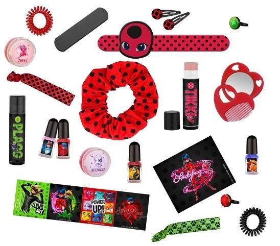 Adventní kalendář Kouzelná beruška a černý kocour. Kosmetický pro děvčata. Obsahuje – 2× sponka do vlasů, 2× prstýnek, 2× gumičku na ruku nebo do vlasů, 2× aršík se samolepkami, 2× mašli do vlasů, 2× rtěnku, 2× balzám na rty, 4× lak na nehty, 4× stíny se třpytkami, 2× placku se špendlíkem.