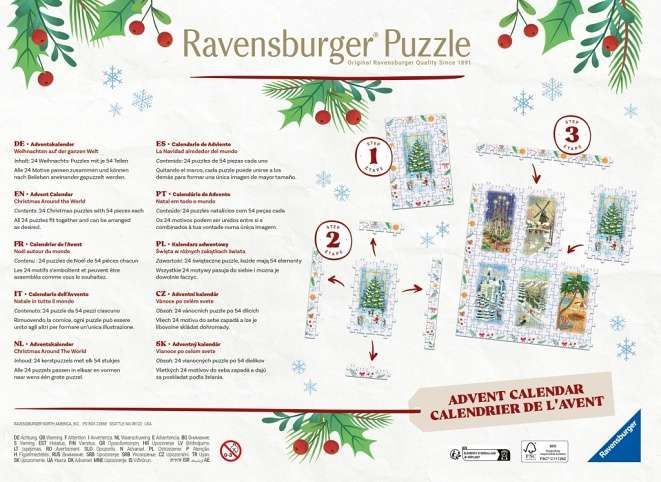VESELÉ VÁNOCE VŠEM ! MOTIVY ZOBRAZUJÍ SVÁTEČNĚ VYZDOBENÁ MĚSTA, ZEMĚ NEBO PAMÁTKY PO CELÉM SVĚTĚ. • 24 vánočních puzzle s 54 dílky, formát: 13,2 cm × 19,8 cm • Všech 24 motivů do sebe zapadá a lze je libovolně poskládat do jednoho velkého obrázku! • Každé puzzle je samostatně zabaleno v ozdobné krabičce (formát: cca 59 × 59 × 64 mm)