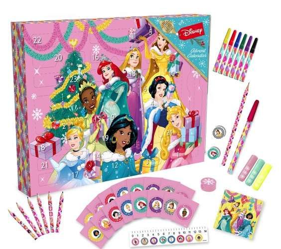 Adventní kalendář – obsahuje 6× pastelky, 6× fixy, 2× gumu, 2× aršík se samolepkami, 1× poznámkový bloček, 1× razítko, 1× HB tužku, 1× propisku, 1× ořezávátko, 3× mini zvýrazňovač.