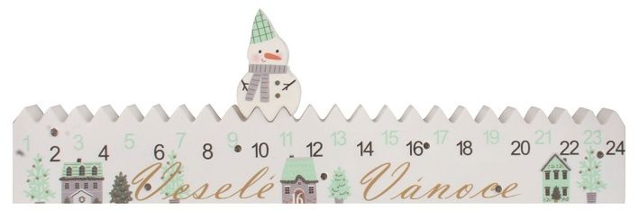 Adventní kalendář „Veselé Vánoce“ s LED na postavení, 40 x 13 x 2 cm Tento dřevěný adventní kalendář s nápisem „Veselé Vánoce“ a LED osvětlením je krásnou dekorací, která zpříjemní čekání na Štědrý den. Díky jemnému podsvícení vytváří útulnou atmosféru a stane se ozdobou každého interiéru. Je určen k postavení na polici, komodu nebo parapet, kde vynikne svým detailním zpracováním i svátečním motivem. Využití: Ideální jako dekorace do obývacího pokoje, dětského pokoje nebo vstupní haly. Kalendář nejen odpočítává dny do Vánoc, ale zároveň dotváří slavnostní náladu díky příjemnému LED světlu. Vlastnosti: rozměry: 40 x 13 x 2 cmmateriál: dřevoLED osvětlenínapájení na baterie 2x AA (nejsou součástí balení)určeno k postaveníTento adventní kalendář s LED osvětlením vnese do vašeho domova teplé světlo, radost a kouzelnou atmosféru vánočního očekávání.