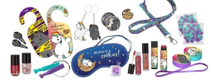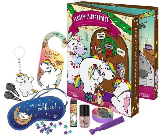Adventní kosmetický kalendář Jednorožec a jeho přátelé. Kalendář obsahuje 2 laky na nehty, 2 lesky na rty, 2 balzámy na rty, 2 kovové sponky, 1 náramek, 2 sáčky konfet do vany, 2 šumivé koule do vany, 2 přívěsky na klíče, 2 čelenky do vlasů, 1 sponka do vlasů, 1 visačka na dveře, 1 šňůrka na krk, 1 odznak, sada špuntů do učí, 1 spací masku. Vše demratologicky testováno, odpovídá přísným normám EU.