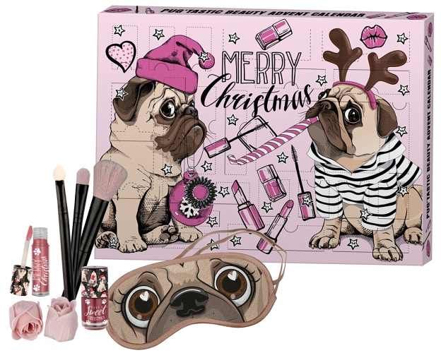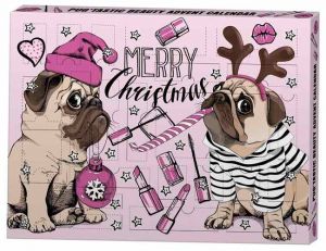 Adventní kosmetický kalednář PUG'tastic – slavnostní dárek pro ženy i teens. Každý den otevřete jedno okénko a až do Vánoc bude objevovat kosmetiku a doplňky do vlasů. Obsahuje – 1× tvářenka, 2× lak na nehty, 6× separátor na nehty, 1× tužka na oči, 2 trio oční stíny, 1 štětec na pudr, 1× houbičkový aplikátor, 1× šteteček na oční stíny, 1× spirálová gumička do vlasů, 2× elesatická guma do vlasů, 2× lesk na rty, 2× minirtěnka, 1× obtisky na nehty, 1× spací maska, 1× tužka na rty. Vyrobeno dle norem EU. Dermatologicky testováno.