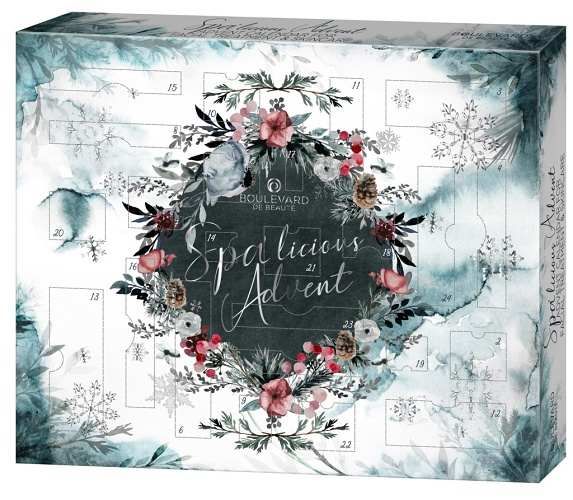Adventní kosmetický kalednář Spa'licious – slavnostní dárek pro ženy i teens. Každý den otevřete jedno okénko a až do Vánoc bude objevovat kosmetiku a wellnes pro pleť i ruce. Obsahuje –1× maska na rty, 2× maska pod oči, 12 výživných náplastí pod oči, 2× pleťovou masku, 1× tělové máslo, 1× peeling na rty, 1× výživný balzám na rty, 1× krém na pokožku, 1× krém na ruce, 1× tělový peeling,1× maska na obočí, 1× hydratační maska, 1× maska na chodidla, 2× voňavá svíčka, 1× vlasová čelenka, 1× mašle do vlasů, 1× tělová pěna a 1× pleťová maska z černého uhlí. . Vyrobeno dle norem EU. Dermatologicky testováno.