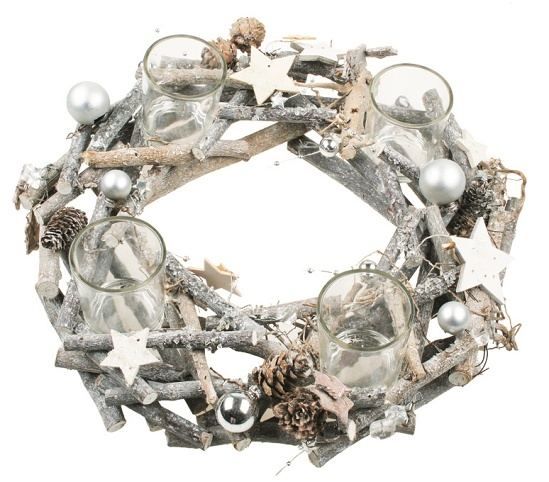 Věnec adventní šedý z větviček s baňkami 30 cm
