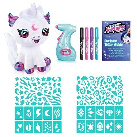 Navrhni a vybarvi si svého vesmírného jednorožce. Součástí tohoto balení je plyšové zvířátko, airbrush nástroj, 4 různé barevné náplně, 100 různých šablon a návod. Plyšové zvířátko si můžeš pomocí airbrushe libovolně posprejovat, můžeš využít různé barvy a šablony. Fantazii se meze nekladou. Pokud se ti vytvořený design přestane líbit, stačí plyšáka omýt vodou a můžeš začít znovu. Plyšákovi svítí kouzelný rok a může odpovědět díky barvě rohu na otázku ano-ne. Výrobek je vhodný pro děti od 6 let a vyžaduje 2× AA baterie, které nejsou součástí balení a 3 baterie LR44, jsou součástí.