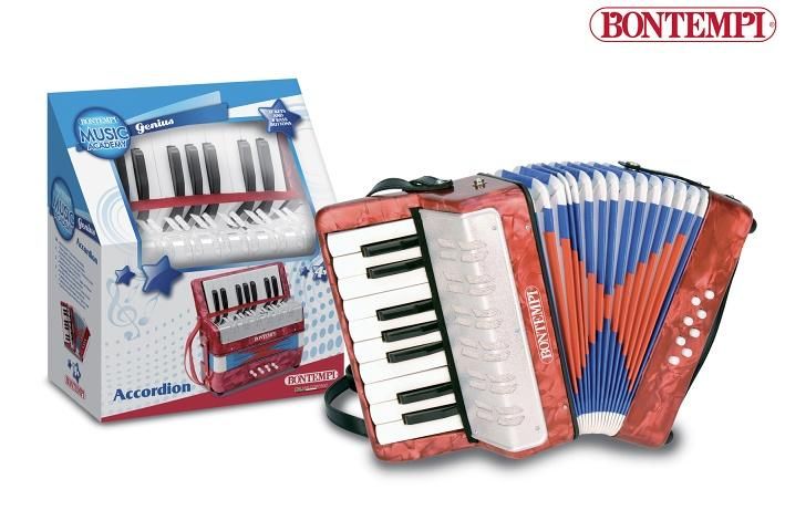 Akordeon se 17 klávesami (C-E) včetně ostrých a 8 basových tlačítek • Kvalita zvuku stejná jako skutečný akordeon • Včetně ramenního popruhu • Dim. 235x120x250 mm