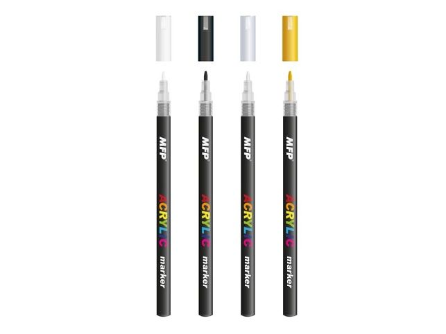 Akrylový popisovač, sada 4 ks balených v plastové krabičce. Tyto akrylové popisovače se vyznačují svou barevnou sytostí i stálostí, a velmi dobrými krycími schopnostmi. Jsou vhodné na všechny nemastné a hladké povrchy, jako jsou plátna, papír, dřevo, kámen atd.