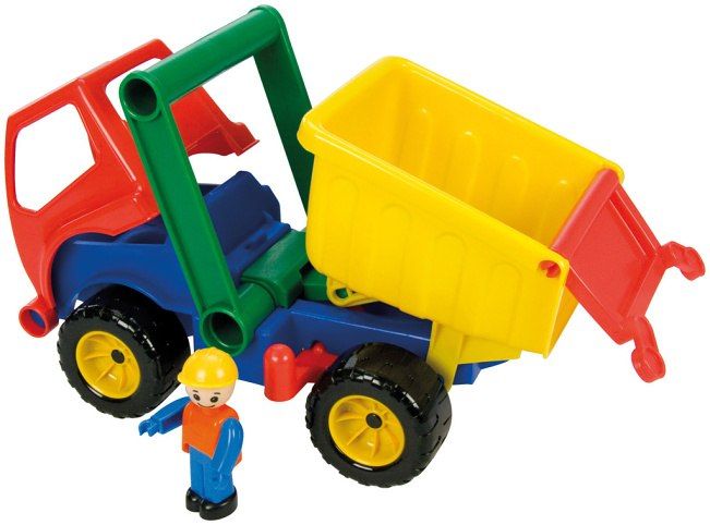 Aktivní auto sklápěč z kvalitního plastu a velmi pevnou stavbou. Plně mechanicky funkční. Obsahuje pojistku proti nežádoucímu vyklopení, odklopitelnou kabinu s aktivním panáčkem.