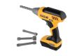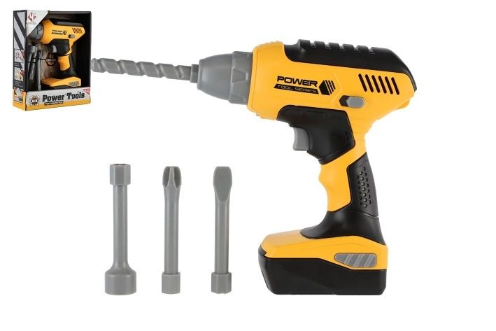 Chceš pomáhat tatínkovi při opravách doma a chybí ti ve tvé výbavě vrtačka? Nevadí! Aku vrtačka se po zmáčknutí tlačítka točí a má vyměnitelné vruty. Vydává zvuky vrtání. Baterie 3 x AAA nejsou součástí balení.