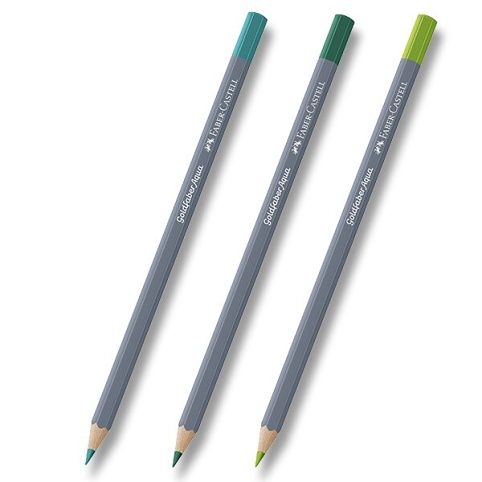 Vysoce kvalitní profesionální dřevěné akvarelové pastelky Faber-Castell Goldfaber Aqua v zelených odstínech mají vysoce pigmentovou tuhu a šestihranný tvar. Tloušťka tuhy 3,3 mm.