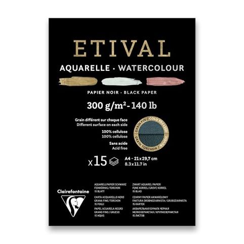 Akvarelový blok Clairefontaine Etival Black Cold Pressed/Rough 300 g má 100% přírodní černý celulózový papír. Papír má z každé strany odlišnou strukturu. Na přední straně je Cold Pressed (středně hrubá struktura papíru) a na straně druhé je Rough (hrubá struktura).