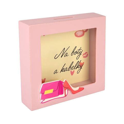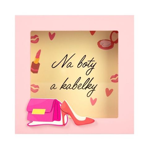 3D pokladnička v rámečku pro všechny ženy. Přední stranu rámečku zdobí kabelka a střevíc. Rozměry pokladničky: 15 ×15 × 4 cm