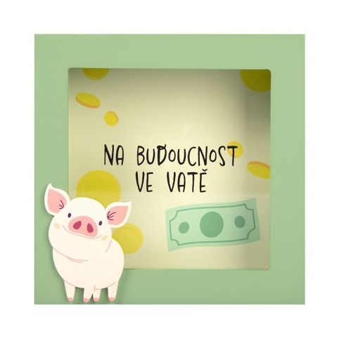 3D pokladnička v rámečku pro všechny šetřílky. Přední stranu rámečku zdobí roztomilé prasátko, zadní stranu pokladničky motiv peněz. Rozměry pokladničky: 15 ×15 × 4 cm