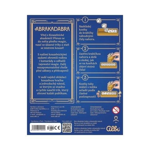Kouzelnická rekvizita, díky které dokáže kouzelník či kouzelnice uspořádat kostky v krabičce. Sada obsahuje obal na krabičku, dno a víko krabičky, 6 kostek a jednoduchý návod. Obtížnost: lehká (1/3) Materiál: plast Rozměry krabičky: 8 × 2,5 × 2,5 cm