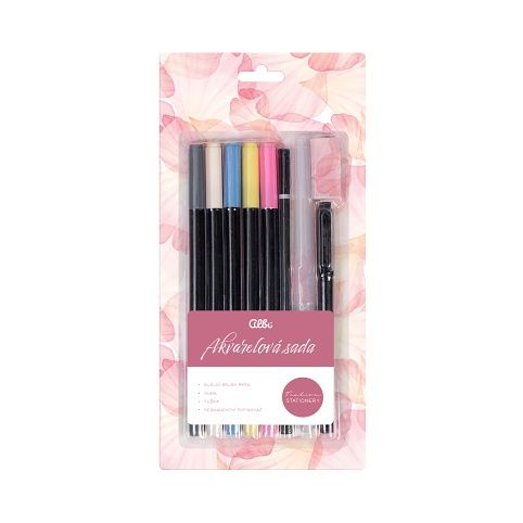 Akvarelová sada obsahuje duální brush pera v 5 barvách, gumu, obyčejnou tužku a permanentní popisovač.