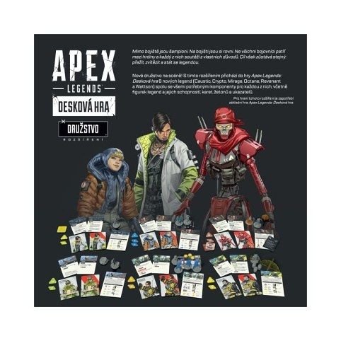 Rozšíření Družstvo přidává do hry Apex Legends: Desková hra novou četu šesti hrdinů – Caustic, Crypto, Mirage, Octane, Revenant a Wattson. Rozšíření obsahuje potřebné figurky, karty, žetony a další komponenty. Balení obsahuje: 6 figurek Legend, 15 figurek schopností Legend, 73 karet, 21 žetonů a ukazatelů, 8 informačních listů Legend, speciální ukládací přihrádky.