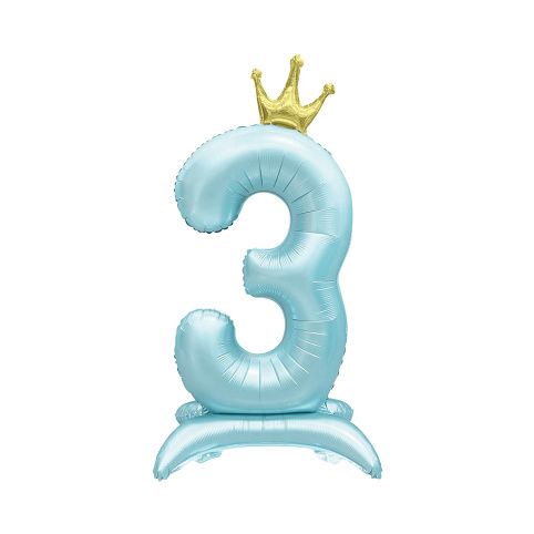 Stojící fóliový balónek ve tvaru světle modré číslice 3 s korunkou je ideální jako efektní výzdoba narozeninové párty nebo oslavy významného jubilea. Jednotlivé číslicové balónky můžete kombinovat pro vytvoření potřebného čísla. Výška: 82 cm Materiál: fólie se saténovou úpravou Balení obsahuje: 1 ks balónku a papírové brčko pro snadné nafouknutí Balónky je možné nafukovat pouze vzduchem.