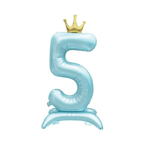 Stojící fóliový balónek ve tvaru světle modré číslice 5 s korunkou je ideální jako efektní výzdoba narozeninové párty nebo oslavy významného jubilea. Jednotlivé číslicové balónky můžete kombinovat pro vytvoření potřebného čísla. Výška: 82 cm Materiál: fólie se saténovou úpravou Balení obsahuje: 1 ks balónku a papírové brčko pro snadné nafouknutí Balónky je možné nafukovat pouze vzduchem.