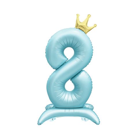 Stojící fóliový balónek ve tvaru světle modré číslice 8 s korunkou je ideální jako efektní výzdoba narozeninové párty nebo oslavy významného jubilea. Jednotlivé číslicové balónky můžete kombinovat pro vytvoření potřebného čísla. Výška: 82 cm Materiál: fólie se saténovou úpravou Balení obsahuje: 1 ks balónku a papírové brčko pro snadné nafouknutí Balónky je možné nafukovat pouze vzduchem.