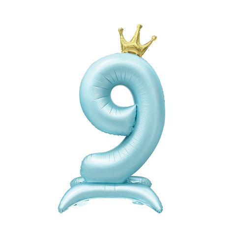 Stojící fóliový balónek ve tvaru světle modré číslice 9 s korunkou je ideální jako efektní výzdoba narozeninové párty nebo oslavy významného jubilea. Jednotlivé číslicové balónky můžete kombinovat pro vytvoření potřebného čísla. Výška: 82 cm Materiál: fólie se saténovou úpravou Balení obsahuje: 1 ks balónku a papírové brčko pro snadné nafouknutí Balónky je možné nafukovat pouze vzduchem.
