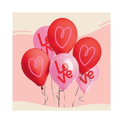 Sada šesti latexových balónků v růžovo-červeném mixu s motivem srdce a nápisy „Love“ se skvěle hodí jako dekorace na svatbu nebo sv. Valentýna. Tato zamilovaná sada obsahuje tři růžové balónky s červeným nápisem „Love“ a tři červené balónky s potiskem velkého růžového srdce. Velikost: 12" – 30 cm Materiál: latex Balení obsahuje: 6 ks balónků Balónky je možné nafukovat vzduchem i heliem.