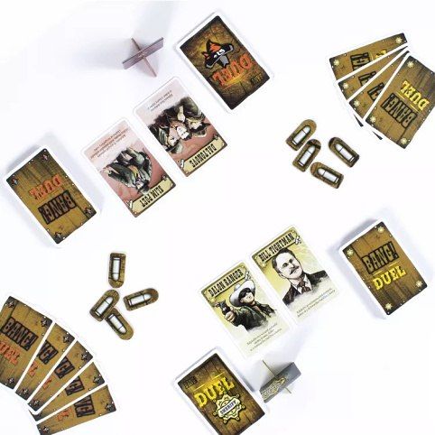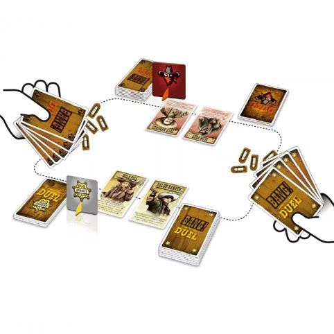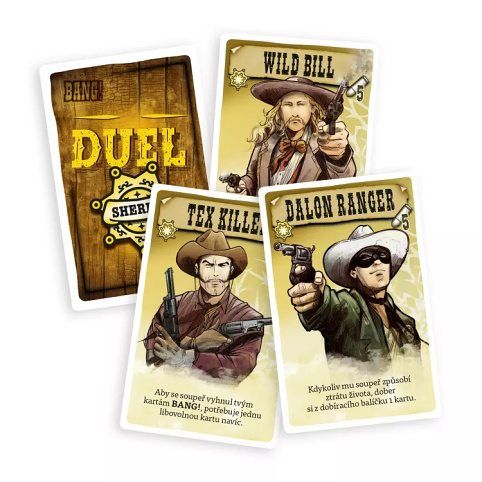 Konečně nadešel čas, kdy se zákon utká tváří v tvář se zločinem. Nelítostný boj do posledního muže si žádá neprůstřelnou strategii a chladnokrevnou taktiku. Rozestavte své pistolníky na místa a udělujte jim příkazy, které vás dovedou k vítězství. Bang Duel je samostatná hra pro dva hráče, ke které nepotřebujete základní hru Bang!. Hráči si rozdělí strany, za které budou hrát – muži zákona proti banditům. Zvítězí ostřílení strážci zákona nebo se jako poslední budou smát nelítostní bandité? Hra obsahuje: 80 hracích karet, 24 karet postav, 4 přehledové karty, 1 kartu přípravy, 20 žetonů nábojů, 2 žetony aktivních postav a pravidla.