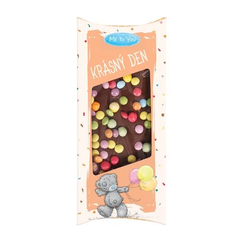 Barevná mléčná čokoláda s dražé a praskajícími bonbóny s motivem medvídka Me to You. Hmotnost: 100 g