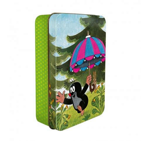 Žvýkací bonbóny se šťavnatou ovocnou náplní obohacenou vitamínem C v krásné plechovce s dětskými motivy z Krtečka. Žvýkací bonbóny s náplní (19 %) s příchutí citron, pomeranč, malina, jablko, s vitamínem C Složení: glukózový sirup, cukr, regulátory kyselosti: kyselina citronová, citrát sodný; želírující látka: agar; aromata, vitamín C, koncentrát ovocné šťávy 0,1 % (citron, pomeranč, malina, jablko), extrakt z kopřivy a špenátu; koncentrovaná šťáva z černé mrkve, barviva: paprikový extrakt, kurkumin. Může obsahovat sóju a mléko. Skladujte v suchu, chraňte před teplem. Průměrné výživové hodnoty 100 g energetická hodnota 1653 kJ/389 kcal tuky <0,3 g z toho nasycené mastné kyseliny <0,1 g sacharidy 97 g z toho cukry 82 g bílkoviny <0,6 g sůl 0,2 g vitamín C 126 mg Hmotnost: 100 g