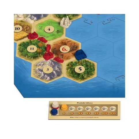 Rozšíření hry Catan, ve kterém hráči objevují ostrovy, zakládají vesnice, dobývají pirátské tábory, loví ryby a obchodují s kořením. Hru nelze hrát samostatně a je potřeba vlastnit základní hru Catan - Osadníci z Katanu. Rozšíření obsahuje: 24 dílů pevniny, 11 dílů moře, 14 dílů rámu, 12 žetonů s čísly, 6 pirátských táborů, 3 stupnice misí, 3 destičky mimořádných bodů, 76 mincí, 88 hráčských figurek, 6 figurek rybích hejn, 24 figurek pytlů koření, 4 přehledy stavebních nákladů a pravidla hry v češtině a slovenštině.