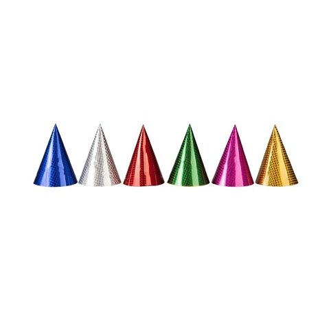 Sada šesti papírových čepiček s holografickým efektem, které rozveselí každou narozeninovou oslavu nebo párty. Balení obsahuje čepičky v holografické bílé, žluté, růžové, červené, zelené a modré barvě. Rozměr: 16 × 11 cm Velikost: univerzální (určeno pro dospělé i děti) Balení obsahuje: 6 ks čepiček s gumičkou