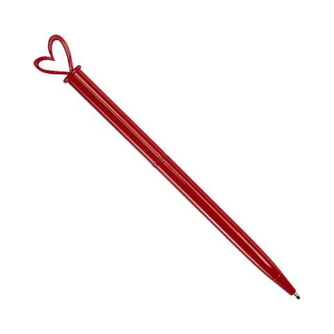 Červená kovová propiska se srdíčkem na vrcholku se otevírá jednoduchým otočením horní části a píše modrým inkoustem. Materiál: kov Barva inkoustu: modrá