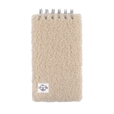 Zápisník s chlupatými deskami v béžové barvě a motivem malé ovečky na přední straně má kroužkovou vazbu a čisté stránky. Rozměry: 9 × 16,5 × 2,5 cm