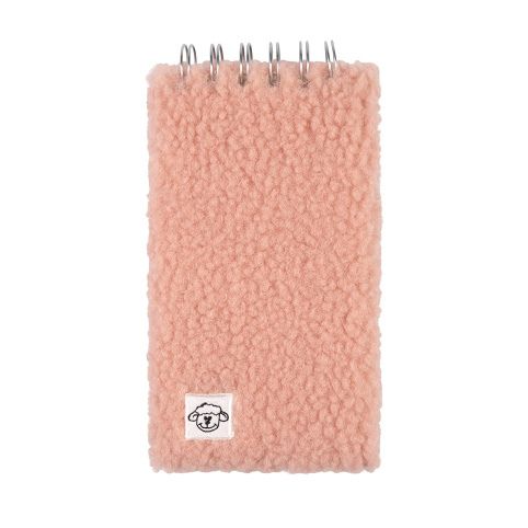 Zápisník s chlupatými deskami v růžové barvě a motivem malé ovečky na přední straně má kroužkovou vazbu a čisté stránky. Rozměry: 9 × 16,5 × 2,5 cm