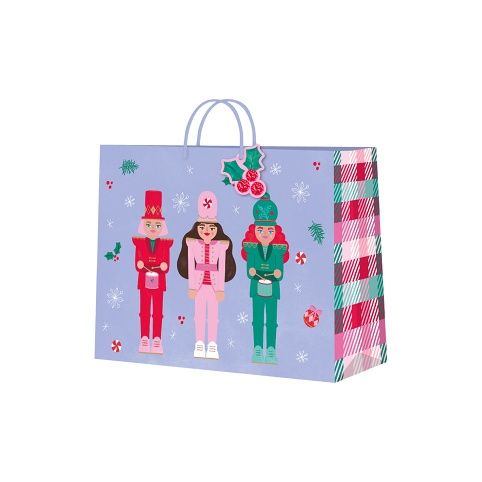 Široká vánoční papírová taška s motivem louskáčků. Fialovo-růžová varianta ideální pro mladé slečny. Rozměry: 22,9 × 9,8 × 17,8 cm
