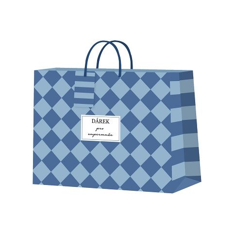 Široká papírová taška s motivem modré šachovnice a nápisem Dárek pro supermuže. Rozměry: 22,9 × 9,8 × 17,8 cm