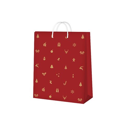 Červená vánoční papírová taška se zlatou ražbou a vánočními motivy. Rozměry: 17,8 × 9,8 × 22,9 cm