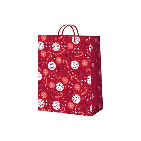 Červená dárková taška s vánočními ozdobami, dárky a cukrátky. Rozměry: 17,8 × 9,8 × 22,9 cm