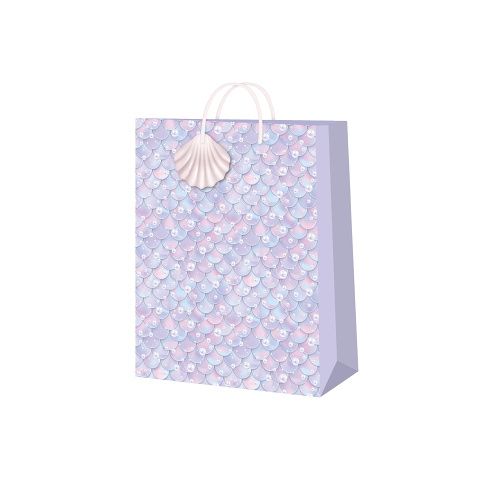 Duhová papírová taška s motivem šupin mořské panny. Rozměry: 17,8 × 9,8 × 22,9 cm