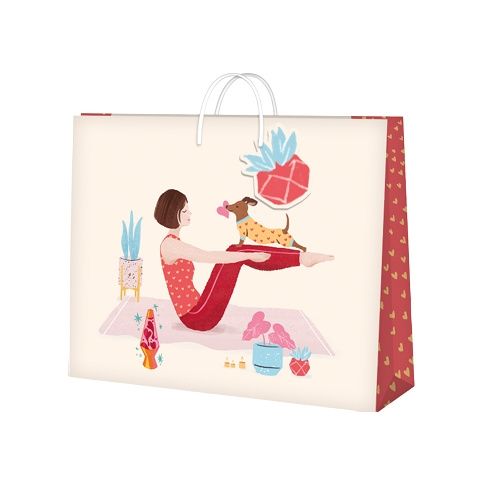Originální papírová dárková taška s motivem ženy, která cvičí jógu se svým pejskem. Taška je netradičně orientovaná na šířku. Rozměry: 22,9 × 9,8 × 17,8 cm (šířka × hloubka × výška)