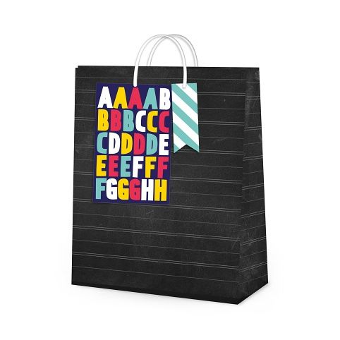 Papírová dárková taška s písmenky k nalepení nabízí vtipný způsob zabalení dárku pro školáky či učitele. Rozměry: 26 × 12,7 × 32,4 cm
