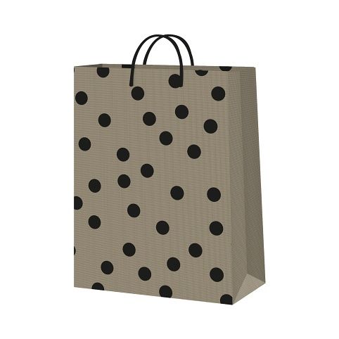 Hnědá papírová dárková taška s černými puntíky. Rozměry: 26 × 12,7 × 32,4 cm (šířka × hloubka × výška)